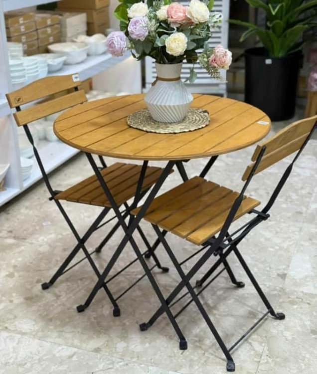ست دونفره صندلی ومیز تاشو چوبی کم جا جنس پلی وود ضداب مناسب تراس بالکن کافه قابلیت چابه چایی اسان قیمت اقتصادی وبه صرفه