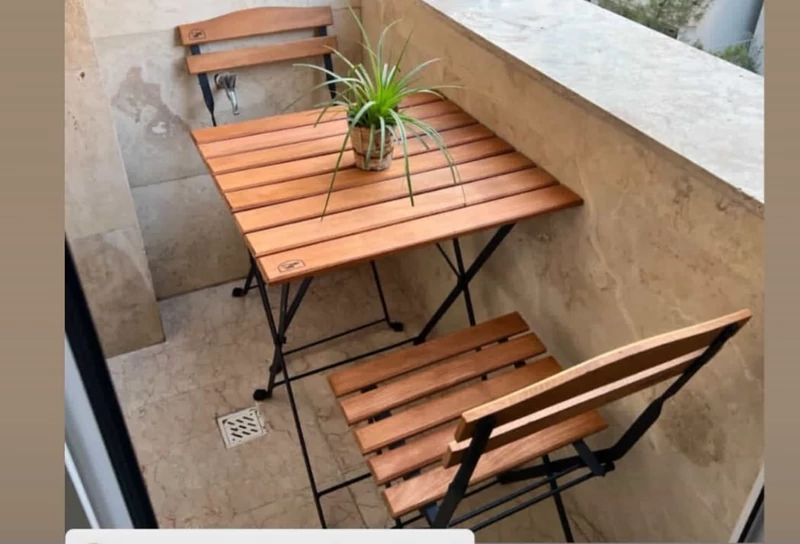 ست دونفره صندلی ومیز تاشو چوبی کم جا جنس پلی وود ضداب مناسب تراس بالکن کافه قابلیت چابه چایی اسان قیمت اقتصادی وبه صرفه