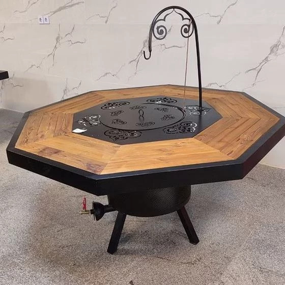 میز اتشدان قطر 150 در ارتفاع 70 زیبا وکاربردی هم اتشدان وهم میز گازی گرمایش فوق العاده از پایین دارای پوشش گرما روی کار چوب ترموود کار شده دارای اویز کتری مناسب 8تا 10 نفره بسته به مدل صندلی