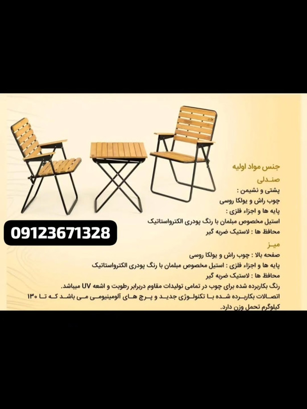 قابل استفاده در کمپ ها و مسافرت جنس بدنه فلز با پوش رنگ استاتیک با دو چوب راش و روسی حمل وزن ۱۳۰ کیلو قابل به صورت صندلی و میز جدا